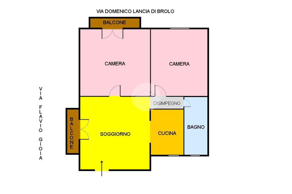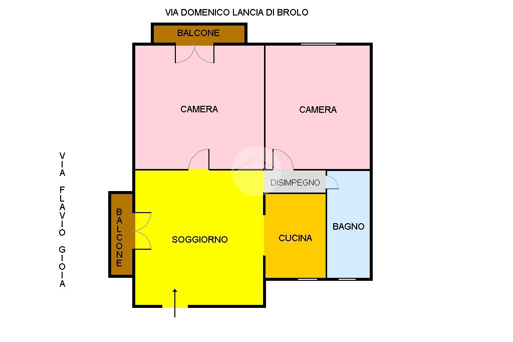 L’appartamento, di 64 mq commerciali, si apre su un soggiorno con adiacente cucinotto in muratura e balcone che espone su Via Flavio Gioia. Un disimpegno conduce alla zona notte composta da due camere da letto, entrambe servite da balcone e finestra che espongono su Via Domenico Lancia di Brolo, e un bagno con esposizione sul retro. La tripla esposizione garantisce ambienti particolarmente luminosi e ben arieggiati durante tutta la giornata.