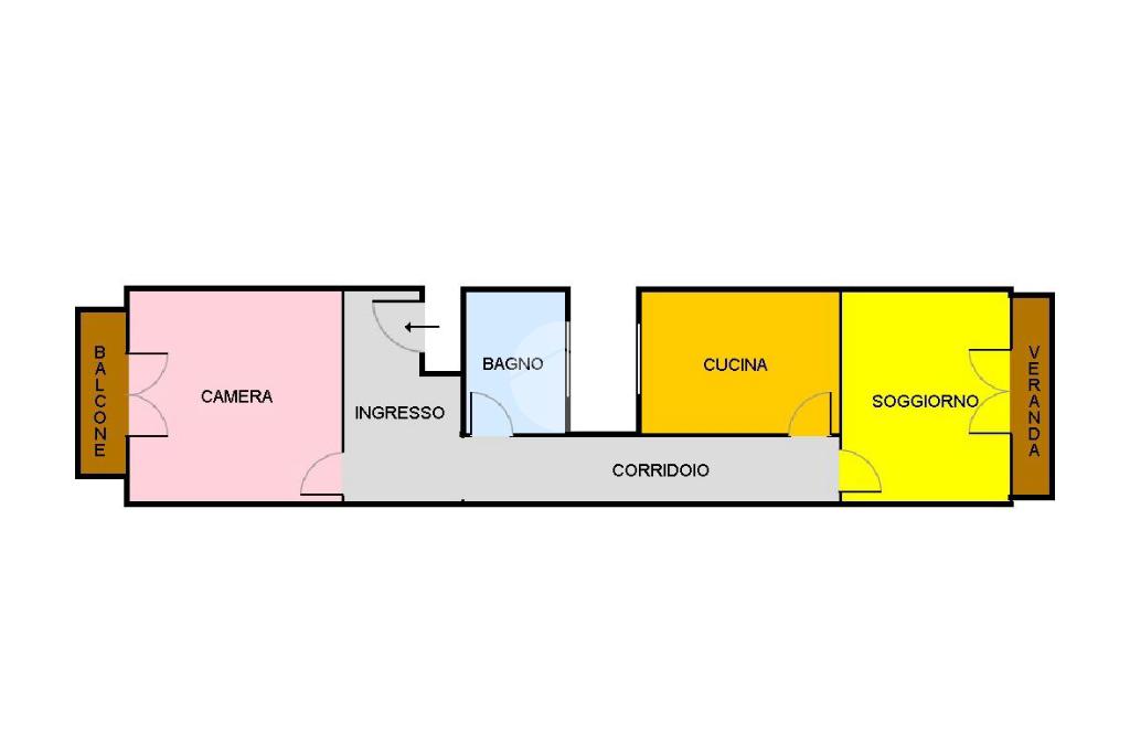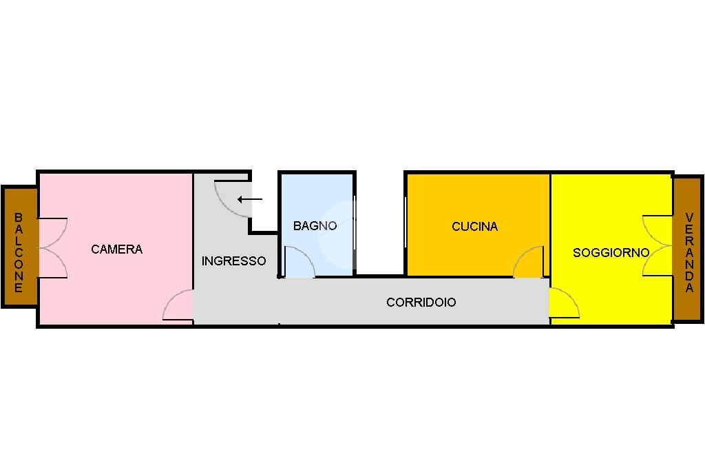 L’ingresso si apre su un corridoio che collega tutti gli ambienti: una camera da letto con balcone su Via principale, un bagno e una cucina spaziosa ed abitabile, oltre a un soggiorno con veranda con esposizione sul retro prospetto. La tripla esposizione rende gli spazi ariosi e luminosi.